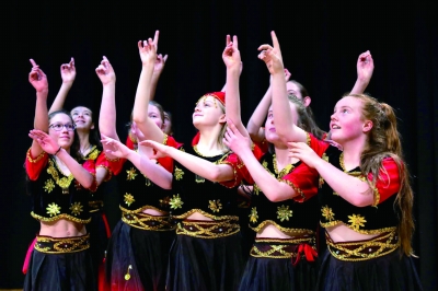 5月23日,中国国防大学军事文化学院代表团走进新西兰维多利亚大学孔子学院旗下的塞缪尔·马斯顿学校孔子课堂为观众带来了一场别开生面的文化交流演出,拥有百年历史的塞缪尔·马斯顿学校的“中国文化小使者”也为观众献上了精彩舞蹈。图为塞缪尔·马斯顿学校11、12年级女生在表演新疆维吾尔族舞蹈《摘葡萄》。