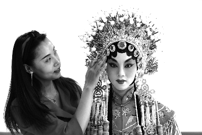 图为6月4日,陕西省京剧院国家二级舞台美术师冯晓梦(左)在京剧戏曲化装课上为学生张予凝整理凤冠。