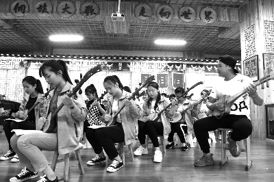图为6月12日,三江侗族自治县三江中学的学生在学习弹唱侗族琵琶歌。