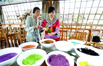 端午节将至,在广西柳州市融安县雅瑶乡,居民用花草汁液把糯米染成彩色,制成独具特色的彩色粽子,煮熟的粽子香糯可口,色彩艳丽。