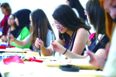 图为土耳其学生手握毛笔书写汉字,感受中国文化的独特魅力。