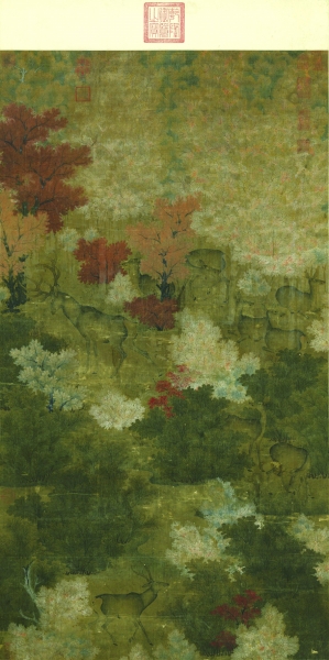 最近,一则拍场新闻引起我的兴趣。在今年的嘉德春拍上,当代某青年画家的《丹枫呦鹿图》拍出了500万元天价。从图片上看,这幅作品无疑就是台北故宫博物院所藏五代无款的《丹枫呦鹿图》的忠实临摹,虽然颜色很鲜艳,用笔可能稍微细致,但仔细对比之下,与原作并没有什么特别不同。唯一的加添,是作者在画的上下两边,各加了一道张大千式的敦煌唐草纹重彩边。