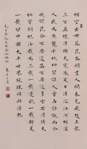 早期的楷书,见于汉魏木简的都很粗糙,经钟繇、卫夫人、羲献父子一代代的完善、美化,才最终确立了它的地位,所以,钟王小楷向被视为楷书正宗。唐代立碑风起,大字促成了楷书新的创格。宋人尚意,发出很多新枝。魏晋小楷一度式微,至元明复古,才得以延续。清代倡言碑学,摒弃馆阁体的同时,魏晋小楷也被边缘化,民国以降,均少有问津者。坚守魏晋小楷的书家,在全国也并不多见。麦氏钟爱羲献父子,潇洒妍美,俊逸安详。不仅在岭南有广泛影响,在全国亦有重要地位。1958年国务院将书写第一部《中华人民共和国宪法》的任务交给麦华三,即是明证。麦氏小楷之笔墨精到,淳美自然,很值得时下小楷作者每以字多、密集掩盖其提按使转功夫缺失者认真学习。