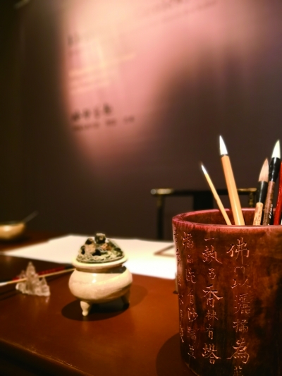此次展览在展厅中复原了颇有传统文人意趣的文房书案,并利用图文展板介绍了展示器物的名称与使用方法。具有中国文人雅士气息的折扇、烘托民间喜庆的大红灯笼、活泼可爱的十二生肖……观众不仅可以品读关良的戏画,聆赏梅兰芳的《贵妃醉酒》,还可以在互动区体验中国画的风骨意趣。