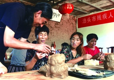 近日,河北沧州泊头市残联联合当地泥塑工作室,免费为20余名经济困难的残疾人士开办了“非遗泥塑”制作培训班,帮助残疾人士掌握一技之长,便于他们在家中实现就业增收。图为在“非遗泥塑”制作培训班上,“三痴斋”泥塑艺人(左二)向残疾人士传授泥塑制作技艺。新华社发(傅新春 摄)