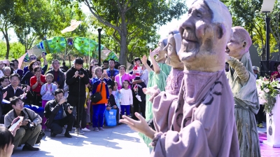 在中外设计师的精心布置下,作为本次活动主会场的台湖公园化作了天然的大舞台,为大型背架人偶环游及国内外各类影偶展演提供了沉浸式空间。