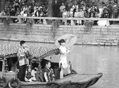 图为参赛选手乘坐摇橹船参加诗词比赛。