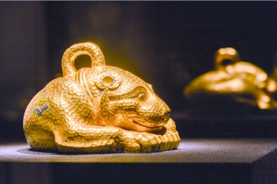 另一件名副其实的黄金“重”器是曾侯乙墓出土的蟠螭纹金盏、镂空龙纹金匕,这是一组器食具,出土时金匕放置在金盏中。金盏重2156克,是已出土先秦金器中最重的一件。据介绍,战国时期的楚国盛产黄金,如湖北随州曾侯乙墓出土金器总重量就超过8000克。此外,黄金器皿的出现是金器发展史上划时代的标志,而曾侯乙墓出土的金盏、勺、杯等是目前先秦时期金制器皿的首次成批发现。