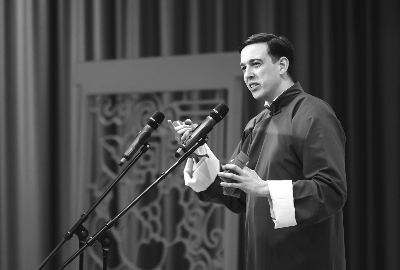 10月12日,在德国柏林中国文化中心,来自德国的快板书演员倪克在第6届德国中国曲艺晚会上表演快板《武松赶会》。