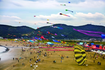 10月13日至14日,2018中国·岱山岛国际运动风筝邀请赛暨全国风筝锦标赛在浙江舟山岱山县鹿栏晴沙景区进行,共有来自国内外的66支风筝代表队参赛。赛场上风筝造型千姿百态,场面蔚为壮观。图为风筝比赛活动现场。