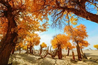 金秋时节,内蒙古自治区阿拉善盟额济纳旗的胡杨树在风中婆娑起舞。