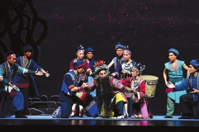 在坚持戏曲本体、彰显琼剧特色的同时,导演还在琼剧艺术立足当代的创造性转化和创新性发展方面做了很多尝试。本剧的题材及主题立足南海,开掘红树林文化,将视角由提倡民族团结、抒发家国情怀的基础层面引向呼唤和平、构建人类命运共同体的深刻维度,彰显了海纳百川、气势磅礴的艺术张力,也体现了现代新编历史剧传承和发展趋势。鉴于此剧主人公身为黎人,剧中自然地引入了一些黎族传统音乐、舞蹈、民俗民风等。如开场的对歌场面,载歌载舞体现了浓郁的黎族风情;剧中祭祀的场景也正是黎族风俗和信仰的体现;而将红树林奉为神灵般的尊崇和守护也恰是当地黎人的习俗和情感表达的方式,彰显了黎族迷人的风采。戏中人根在海岸、戏在海上,音乐声腔自然而然又融入了南海渔歌元素,运用在恰当的戏剧情境中,韵味独特、锦上添花,展现了海南多姿多彩的文化魅力。尤其值得一提的是,该剧以海南黎族民歌《久久不见久久见》为主题串联,通过剧情的推进,人物关系的变化,将原本简单表现男女爱情的歌曲升华成了一首凸显民族品格、彰显爱乡爱国情怀的悲情壮歌,使原始、质朴的黎族文化在红树林精神映照下更加深沉厚重。