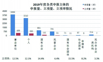 从各类项目主体的申报量、立项量和立项率看,国有机构申报4951项,立项资助641项,立项率约12.9%;非国有机构申报1102项,立项资助66项,立项率约6%。