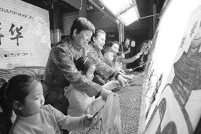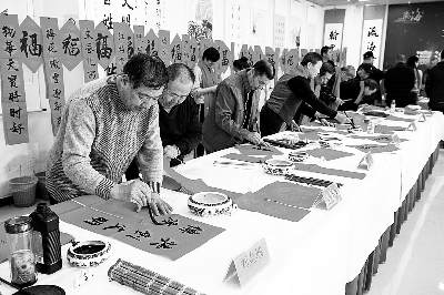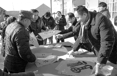 ▶ 近日,由山东省济南市文广新局举办的“我们的中国梦”——春联送农家活动走进济南市南山管委会东岭角村和商河县南大刘村。济南市书法家为两村群众现场创作500多张(套)“福”字和春联。 本报驻山东记者 苏 锐 摄 |