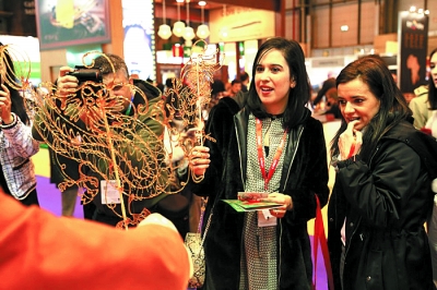 在循环播放中国旅游宣传片的大屏幕前,专门开设的中国民俗文化展示台吸引了大批观众。马德里中国文化中心和驻马德里旅游办事处特别安排的少林武术展示、糖画制作、书法、民族乐器、茶艺表演等活动成中国展区亮点。