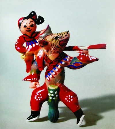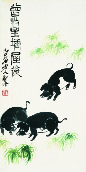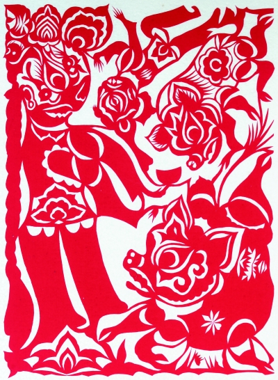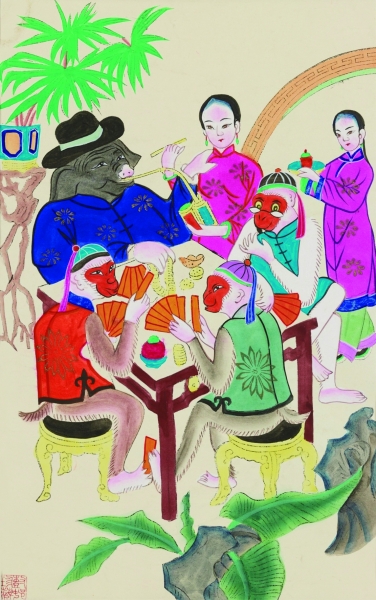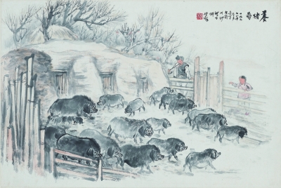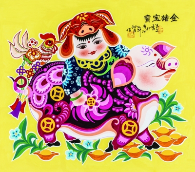 农历己亥年是猪年,按十二生肖的排位,亥猪居末位,是唱压轴戏的。以后又从子鼠开始,重新轮换。一谈起猪,总会联想起《西游记》中的猪八戒,其形貌是猪首人身,细目长吻大耳,性格憨呆,虽能出力劳作,但有时懒散贪吃好色,耍些总会被金猴拆穿的小狡狯,颇具喜剧色彩,是引人兴味的小说人物,其形象广泛出现于戏剧、影视以及民间工艺品(年画、剪纸、木雕、泥塑)中,为广大民众所喜爱。