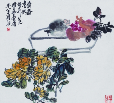 缶翁以书法入画,风格雄强,而奇石最能演绎其审美取向。他描摹各种植物时,常配以造型奇特、风格古朴的顽石,取其突兀峥嵘的体势,使画面气势磅礴。他喜欢画体量大的石头,有意让石和藤本植物相映衬。石之简明厚重与藤之繁茂轻灵,形成互补,寻求动静、疏密、轻重、块线之间的对立统一,极尽变化呼应之能事,画面有“濡毫作石石点首,倚石写花花翻空”的妙趣和神韵。