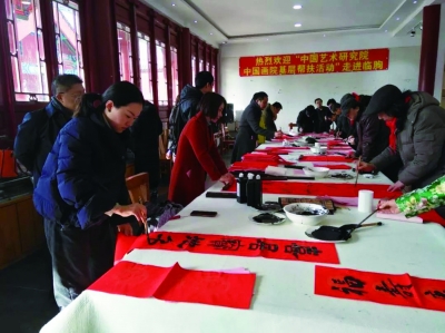 此外,还有很多画院深入社区、深入学校、深入军营,用实际行动“文化惠民、文化为民、文化乐民”。如1月21日,湖北省美术院3名文化志愿者和恩施州美术家协会工作人员一起来到湖北恩施龙凤镇龙马村开展荆楚“红色文艺轻骑兵”文化惠民活动。湖北省美术院多年来持续开展各种文化惠民活动,从“优秀美术作品进万家”到荆楚“红色文艺轻骑兵”,改变的是活动名称,不变的是服务基层、惠及百姓的初心。1月25日,湖南省画院开展了新春慰问活动——“送温暖、送春联进便河边社区”。广西桂林画院党支部在书记龙建忠的带领下,来到桂林市永福县苏桥镇大罗村,与桂林戏剧创作研究院共同开展了文化“三下乡”活动。