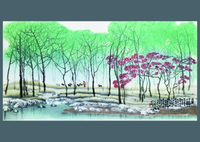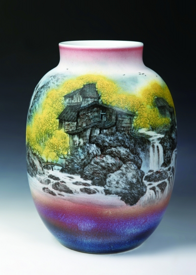 因此,冯绍华所创作出来的作品,让我们有了在另一种物质媒介上去真正体味中国山水人文意境的可能。它们是在一种基于泥土厚重感之上的对空灵或性空的一种寄托或瞻视,不是聚拢在一起的现代人的那种心绪上的漂浮不定,而是落地生根、情有所依、枝繁叶茂。在大气磅礴之中透出一种独特的灵性,这使得以土为根基的釉面的物理空间顿时发生了一种最为深刻的甚至可能是令人荡气回肠的翻转和超越。山水画面映射出来人生际遇的种种遐想,而深入其中,便是一种人生境界的再提升,而若能够跳出其外,又将是一种自我心灵在自然蔓延中的无限升华。这恐怕是山水画所具有的一种境界,而在经过了窑炉的高温煅烧之后,又在这文人山水画的意境之外,平添了许多让人心灵跳跃和激荡的靓丽之色,使你可以对其触摸,可以亲近,可以揽之入怀,艺术家的创造力也便在一种有限的空间里以及特殊的材质上得到了无限的释放。