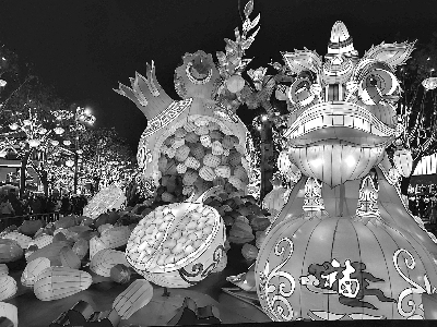 陕西省西安市区的各种花灯把春节点缀得五彩斑斓。图为现代唐人街上的一组以西安市花石榴花为造型的花灯。