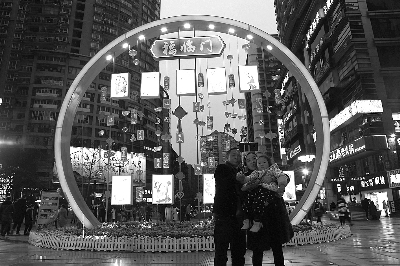 春节期间,重庆市沙坪坝区三峡广场的迎春灯饰璀璨夺目、美不胜收,吸引了广大市民、游客前往观灯祈福,体验传统与现代相结合的文化魅力。图为市民在“福临门”主题灯饰前合影留念。 侯华琳 摄