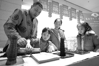 2月7日,中国园林博物馆邀请市民赏花艺、看年画、观灯彩、学非遗、听民乐,一同在园林中度过丰富多彩的新春佳节。传统泥塑彩绘、北京面塑、津派麦秆画等18项传统技艺展示以及丰富多彩的非遗体验活动让观众大呼过瘾。尤其在室内展园苏州畅园,几近绝版的20幅苏州桃花坞木版年画与观众见面,令人大开眼界。图为小观众现场体验木版年画制作。