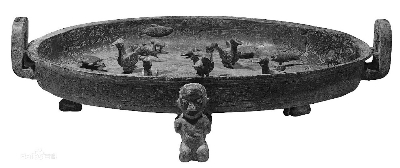 晋公盘是2600多年前晋文公特制的青铜礼器,口径40厘米,总重7000余克。晋公盘浅腹平底,内底中央饰有一对精美浮雕龙盘绕成圆形。双龙中央,有1只立体水鸟。双龙之外,还有4只立体水鸟和4只浮雕金龟。再向外延,又有3只圆雕跳跃青蛙和3条游鱼。最外圈,则有4只蹲姿青蛙、7只浮雕游泳青蛙和4只圆雕爬行乌龟。值得一提的是,这些圆雕动物都能在装置原处作360度转动,鸟嘴可以启闭,乌龟头也可以伸缩。整个器物雄浑多姿,体现了我国春秋时期青铜器制作的工艺水平。更为珍贵的是,在晋公盘内壁还发现珍贵铭文7处,每处3行,共183个字。这些铭文清晰呈现了“春秋五霸”之一晋文公时期的晋国盛世气象,传递了极为珍贵的历史信息。