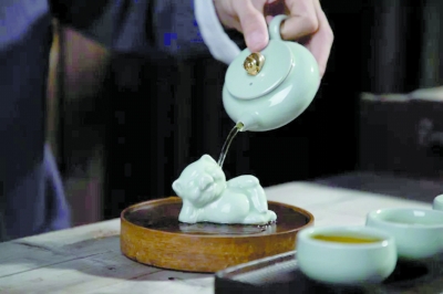 这款汝瓷茶具的茶壶上的细节与巧思表达着祝福,盖粒上可爱的小金猪、出水的把控,器物陈列设置配上沉甸甸的厚朴质感,呼应独特天然的汝瓷材质;壶盖小金猪,栩栩如生,意蕴富足安康;汝瓷如玉,细腻柔滑意蕴温和儒雅,在不同的光线映刻下,一组创意和谐共生;“金”与“玉”的碰撞,生肖与名物的结合,别具匠心。
