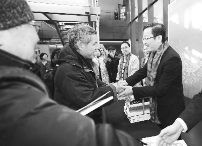 2月5日正月初一,国家图书馆馆长拜年活动在国图总馆北区举行。国家图书馆馆长饶权率馆领导班子及相关部处负责同志喜迎己亥猪年首批读者的到来,并向前三位入馆读者赠送了拜年封、文津图书奖获奖图书、《中华传统文化百部经典》部分图书以及《佳联赏析:亥猪拱福》一书。喜获赠书的第一名入馆读者赵慕天在大年夜看完春晚就从家来到国图排队,他表示,能在大年初一第一个进入国图并获赠经典图书,格外有意义。