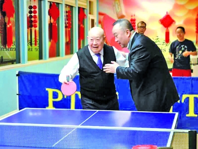 2月1日,在旧金山市的半岛乒乓球俱乐部,传出一阵又一阵的喝彩声。走近一看,抬眼所见皆是红色的中国结、红色的福字和红色的球拍、红色的海报,浓浓的年味让人仿佛回到了中国。 原来,这里正在举办“欢乐春节——中美青少年乒乓球交流活动”。来自中国上海的两名10多岁的乒乓小球员,带着中国新年的祝福来到旧金山,与美国的同龄青少年乒乓球爱好者交流切磋。尚长荣受到感染,兴致勃勃地与美国乒乓球小球员切磋起来。