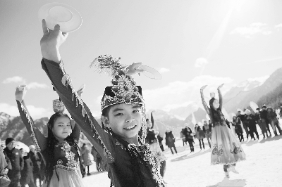 图为在新疆天山天池景区,小朋友在社火表演中跳舞。