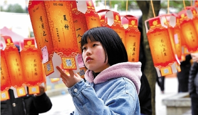 2月8日,湖南省湘西土家族苗族自治州永顺县在县城休闲文化广场举办灯谜竞猜活动,以传统民俗方式迎接新春。图为一名中学生在认真阅读谜面,猜谜语。