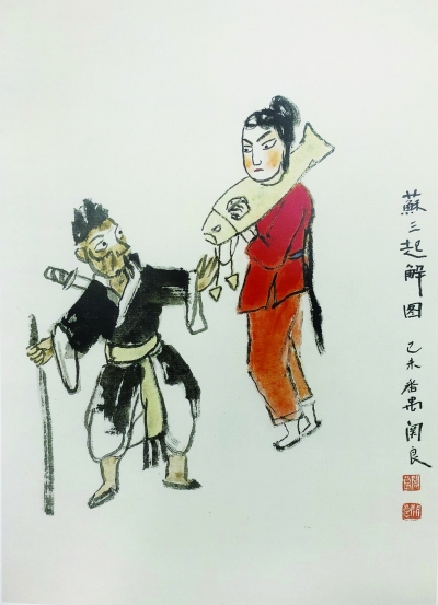 雕塑家、文艺理论家王朝闻对关良水墨戏剧人物画的创作非常熟悉。在评论《苏三起解图》这幅画时,他特别注意到关良所画苏三和崇公道两人的“眼睛”,认为它们使观者可以想象甚至体会到这两个人物各自的“神气”。画戏曲人物的眼睛,是关良极为拿手也最费心思的。他曾在《简谈我的彩墨戏剧人物画》中谈到自己创作水墨戏剧人物画的六个方面,其中,讲到“传神”时,关良特别强调了“点睛”在传神方面所起的决定性作用。他作水墨戏剧人物画,通常是等水墨快干的时候画眼点睛,这最后的一笔是作品成败的关键。用关良自己的话来说,“这是一项很费心思的工作,往往一笔之失,前功尽弃,因为画中人的喜、怒、哀、乐,此时此刻全凭笔下一点来表现。”画出了人物的“神气”,也是关良的水墨戏剧人物画最令人拍案叫绝之处。当然,这离不开他几十年如一日地对戏剧的痴迷研究。