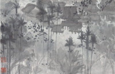 《晨润》就颇能体现蒙发祥的艺术个性。在作品中,蒙发祥向观者展现了这样一幕动人的场景:晨曦初现,椰林似醒未醒,气氛静谧。迷蒙的水雾无声地弥漫着,让草木的叶子变得湿漉漉的,也让农家竹楼若隐若现。对于这种海南乡村里常见的景物,蒙发祥力求画出新意。在创新的过程中他没有生硬地割裂传统,而是把现代绘画的手法与传统中国画中的“宿墨”与“积墨”等技法融会贯通、综合运用,多给人趣味天成之感。比如他笔下几抹浅淡的墨痕,可以表现朦胧的村舍侧影,也可以表现葳蕤的草木;墨痕间的留白,可以表现缥缈的云雾,也可以表现清亮的溪水。如此等等,不一而足。他的画是具象的,但潜含着抽象艺术的味道,点、线、面等诸多元素汇成了丰富的笔墨乐章,近看几不辨物,远观却层次丰厚,充盈着梦幻般的诗意情调。