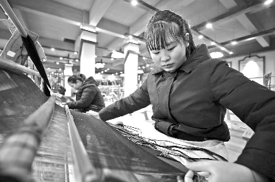 春节假期过后,湖南省张家界市武陵源区土家族织锦企业工人回到工作岗位,忙着赶制顾客的织锦订单。当地的土家族织锦产品不仅走俏旅游市场,还远销海外,成为旅游开发、农民增收致富的重要项目。图为2月12日,工人在张家界市武陵源区乖幺妹土家族织锦基地工作。