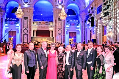 嘉宾舞会现场合影(左二:中国舞蹈家协会分党组书记、副主席兼秘书长,中国国际标准舞总会主席罗斌;左三:奥地利联邦议会议长英戈·阿佩;左六:中国驻奥地利大使李晓驷;左八:中国国际标准舞总会副主席兼秘书长王永刚) |