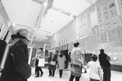 春节期间,北京市朝阳区文化馆以“福满京城 春贺神州”为主题,围绕亲情、和睦、团聚、共享天伦及辞旧迎新等蕴含在春节这一传统节日中经久不变的内涵和元素,从百姓视角出发,以共同参与、共同感受为主旨,举办了“新春大吉”文化庙会,书法家们不仅将写有“百家姓”的灯笼装置在文化馆内,营造了喜庆祥和的节日氛围,还为群众题写春联、赠送“福”字。