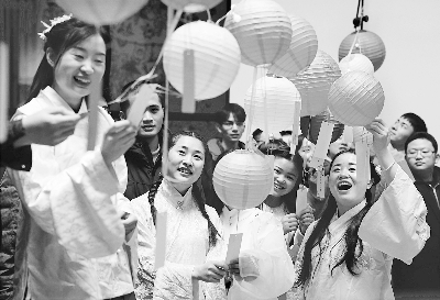 2月19日是元宵节,重庆市沙坪坝团区委组织入住重庆市首家青年人才驿站(为大学毕业生求职提供14天免费住宿的公益单位)的20多名青年人才和志愿者,用体验汉服、诵读经典诗词、猜灯谜、吃汤圆等传统方式共同欢度佳节。
