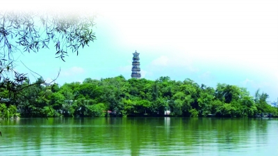 湖心翠影掩着飞耸的檐脊,一缕禅意就在芳洲花径间的留丹亭上飘起,弥漫了湖面的一角。竹影依水,蕉荫满墙,秋枫的枝叶间响着蝉鸣,心中自生清凉。一庭风月故人来,苏才翁会效乘鹅仙人,凌波来觅故地遗香吗?晨昏时分,这片绿岛应发钟鼓之鸣。