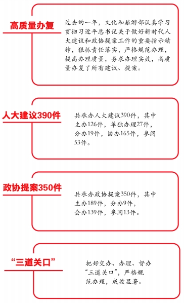 文化和旅游部还高质量办复了地方戏曲院团改革、加大对西部地区公共文化服务体系建设支持力度、规范艺术品交易秩序、降低重点国有景区门票价格、规范民宿管理、全国游学市场监管、推进粤港澳大湾区文旅融合发展等多项建议、提案。