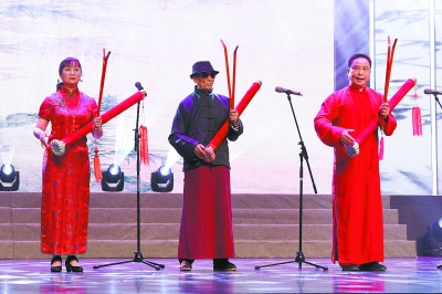 “曲艺传承是一个创新发展的过程。”浙江永康市非遗保护中心主任吕美丽说,社会在进步,曲艺的语言和表现形式必须具有时代感,唱腔也要丰富起来,这样才能被今天的观众接受。以前,鼓词艺人右手击打盆鼓,左手打竹板,一人演唱多角,单口说唱,在舞台呈现上略显单调。2017年,为了使永康鼓词在舞台表演形式上有更好的突破,永康市非遗保护中心在保留永康鼓词本质特征基础上大胆创新,改“坐唱”为“站唱”,首次尝试设计唱腔音乐,并加以乐队伴奏的形式演唱,让人耳目一新。