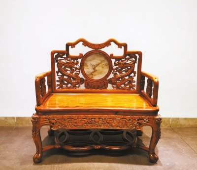 另两件难得的家具,是符集玉多年收藏当中的压箱底之作,一件是海黄八仙桌,另一件为广作风格透雕龙纹宝座。八仙桌是传统中堂家具中的主角,有时做贡桌,有时待客做茶桌餐桌之用。宝座则造型别致,线条柔婉,其上龙飞在天颇显劲挺韵味,像这样广作风格的精美家具目前极为少见,无疑有至高的审美价值和收藏价值。