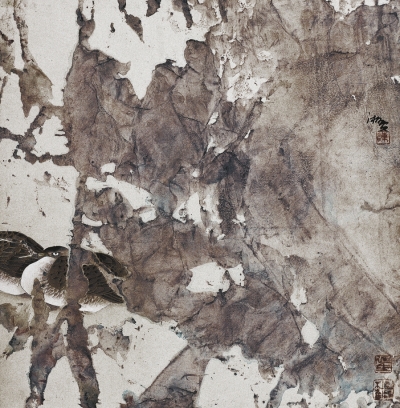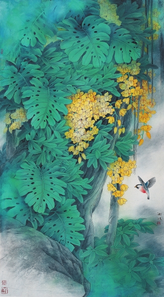 陈湘波先生的画展为我们带来一方明朗清新的艺术世界,在这一批形制精美、内涵儒雅、笔墨精湛的花鸟作品中,突出地展现出他的性格、情怀与精神追求。在当代中国画坛,他是一位深入研究传统又致力于艺术创新的画家,长期沉浸在花鸟画研究领域,既把握着传统花鸟画重在意境与表达花鸟生机的特色,又不断地在笔墨上融汇现代绘画的形式语言。依托他优秀的造型秉赋,加上他长期在花鸟形象上的写生积累,他在空间情境和花鸟造型上别开一种格式,在有限的画幅中精心推敲布局,在具象的形态底层暗含抽象的节奏,空间虚实相间,近远跌宕,让人感受到花鸟的生命驻落在天地之际,有其自己的生命世界。在笔墨语言上,湘波先生对传统也是在取用中自立,在融合中创新,其作品兼有工笔与写意两种语素,在运用时随心所发,随性而施。他造型的线条颇有劲健之力,线形、线质、线势耐人寻味,而在用墨用彩上则特别表意抒情,墨气与色光交织互映,令花鸟的生机焕然而发,幽静清远的意境无限悠长。