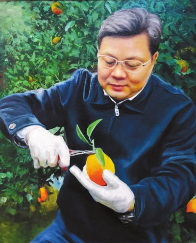 游历昭君故里秭归时,了解到当时的秭归县委书记卢辉为了工作呕心沥血,从不过周末,脚步踏遍了全县的山山水水。深为感动的向斌,以秭归盛产的橙子为题材,绘出了题为《硕果》的卢辉肖像画。
