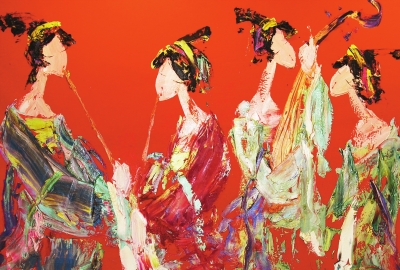 人物画是王成宇作品中出现较多的一种题材,他通过对一系列过去百年间钟爱和厌恶的人物形象进行艺术加工,从而达到创作艺术巅峰。王成宇看似故意地创作出了一些滑稽愚蠢的人物,拉长了他们的身形,并顽皮地从中取乐。这种扭曲人物原型的创作,折射出王成宇丰富的创造力,显示出卓越运用色彩并使之和谐呈现的技艺。但很多时候,并不是色彩给他的画作赋予了生命,是生命的色彩为其画作增添了活力,当他用一笔漩涡勾勒出一件汉服时,这一点尤为明显。