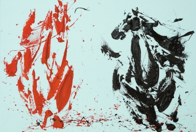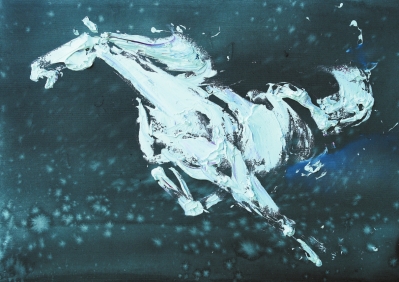 不善言辞的王成宇脑海里有很多大胆的想法,穿透时间迷雾的洞悉力,在他的笔下,浪漫而抒情地表达出来。京剧角色欢聚一堂喝茅台、一群小丑穿戏服围绕自拍、桃园三结义喝红酒、写意的骏马眼睛却透露锋芒……他的画作处处隐藏着细节,每一幅作品都值得细细观赏和品味。