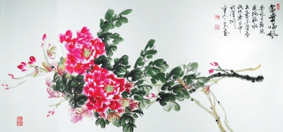 他的绘画,多与牡丹有关。因牡丹贵为国花,花品花色一流,且花期长,富有观赏性。古今文人墨客,似都对牡丹有一种独特的情怀,大概与其蕴意真善美、富贵吉祥分不开。婀娜多姿的牡丹,内涵丰富,极具品味空间,寄托着人们对美好人生的向往和追求。