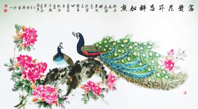 这种艺术主张,在童尽一的大多作品中皆可窥见。其画作《富贵临风》,多姿的牡丹春天开放,迎着东风盛开,向上向善向美的气息扑面而来。尾部几瓣枝叶似连接又不连接,实际上是意在连接。童尽一喜以孔雀入画,从古至今,孔雀被视为“吉祥鸟”,孔雀与牡丹结合,蕴意富贵吉祥。作品《富贵花开》便是其中一幅代表作。画作运用中国传统点线面的绘画手法,在浓淡、疏密之间描画出逼真的孔雀羽毛,呈自在悠闲之态。此画以孔雀的怡然自得寓意社会的安宁祥和。留白处,又能给人以无限想象:还有没有孔雀,还有没有牡丹?这种表现,是直接的,又是隐喻的;是形象的,又是抽象的;是一目了然、直达心扉的,又是充满意味、耐人咀嚼的。