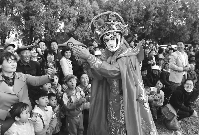 5月15日傍晚,甘肃省临洮县马家窑村上演了一场独具特色的篝火晚会,参加第三届马家窑文化节的嘉宾和当地群众围着篝火载歌载舞,共度美好时光。第三届马家窑文化节于5月16日开幕,举行了陶艺作品展、马家窑文化艺术论坛等活动。 图为5月15日,在甘肃省临洮县马家窑村瓦家坪,群众观看变脸表演。