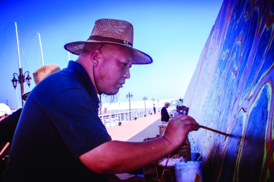 如何在这样一个既不乏工业氛围,又充满海港味道和时尚气息的地方绘制《山海经》图像,许英辉有着自己的考量。“《山海经》以山川和河流为主线,共有十八经,鉴于秦皇岛的独特地理位置和海洋文化,我在创作上选取了《山海经·东山经》中的鱼、鸟等精灵异兽,包括最具象征性的当康、诸犍、比翼鸟、精卫鸟、帝江、扶桑树、金乌鸦等。由于帆船码头的时代感非常强,因此我的艺术图式既要当代、不落伍,又要能很好地融入周围环境,并能吸引人们的目光,进而引发他们对《山海经》、对中国传统文化的兴趣。”因此,如何将中国传统绘画精髓挖掘出来,并体现在这面1000多平方米的壁画墙上,是他着重思考的。许英辉介绍,在具体的创作中,他充分考虑了环境因素和审美因素,从艺术的图式、颜色、创作方法、造型风格等方面入手,力求与环境和大众审美合拍,“这些具有当代视觉风格的绘画不是陈旧的,是我对传统文化理解、吸收后的创新之作。我希望观众既能看得懂它们,又能通过它们看到《山海经》与当下生活的关联。”